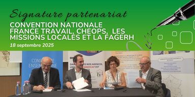Le jeudi 18 septembre 2025 a été signée la convention entre France Travail, Cheops, l'Union nationale des Missions Locales (UNML), et la Fagerh en présence de Madame Bénédicte PEWZER, Présidente de la FAGERH, Monsieur Thibault ROMATET, Directeur Général Adjoint Délégué en charge de la Stratégie et de la Transformation France…