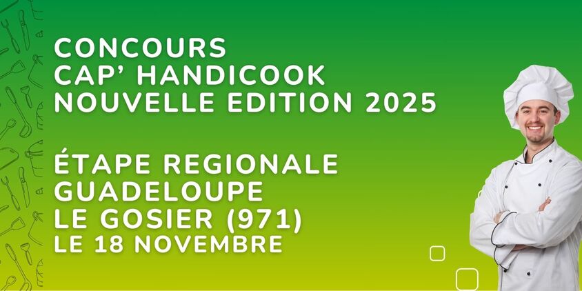 Pour la nouvelle édition 2025 du grand concours culinaire Cap'Handicook, l’étape régionale Guadeloupe aura lieu à Le Gosier (971) le 18 novembre, durant la Semaine Européennes de l'Emploi des Personnes en situation de Handicap (SEEPH)
