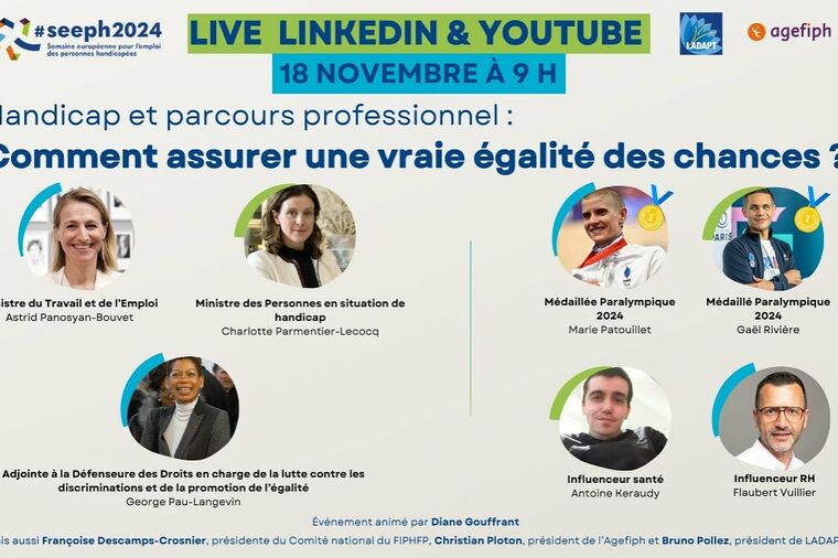Conférence de lancement de la Semaine Européenne de l'Emploi des Personnes en Situation de Handicap, le 18 novembre, organisée par l'Agefiph, le Fiphfp et l'Adapt, en présence de France Travail et Cheops